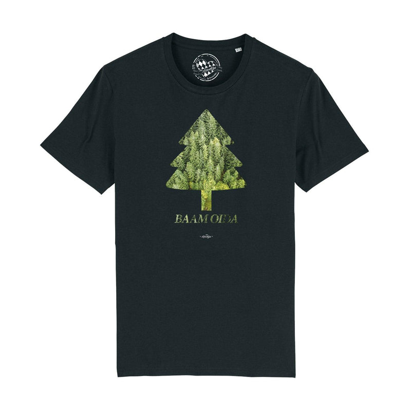 Schwarzes Herren-T-Shirt mit weißem „BAAM OIDA“-Schriftzug, Rundhalsausschnitt, aus 100 % Bio-Baumwolle.