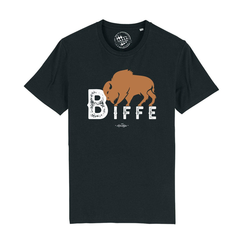 Schwarzes Herren-T-Shirt mit weißem Mundart-Schriftzug „Biffe“, Rundhalsausschnitt, aus 100 % Bio-Baumwolle.