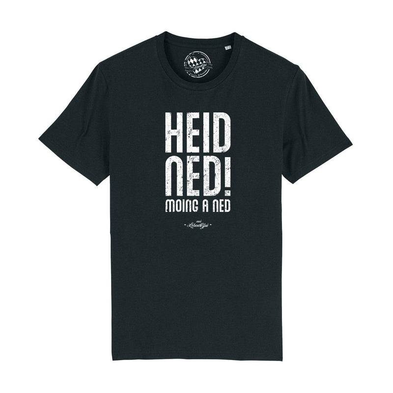 Schwarzes Herren-T-Shirt mit weißem Frontprint „Heid ned moing a ned“, Rundhals, 100 % Bio-Baumwolle.