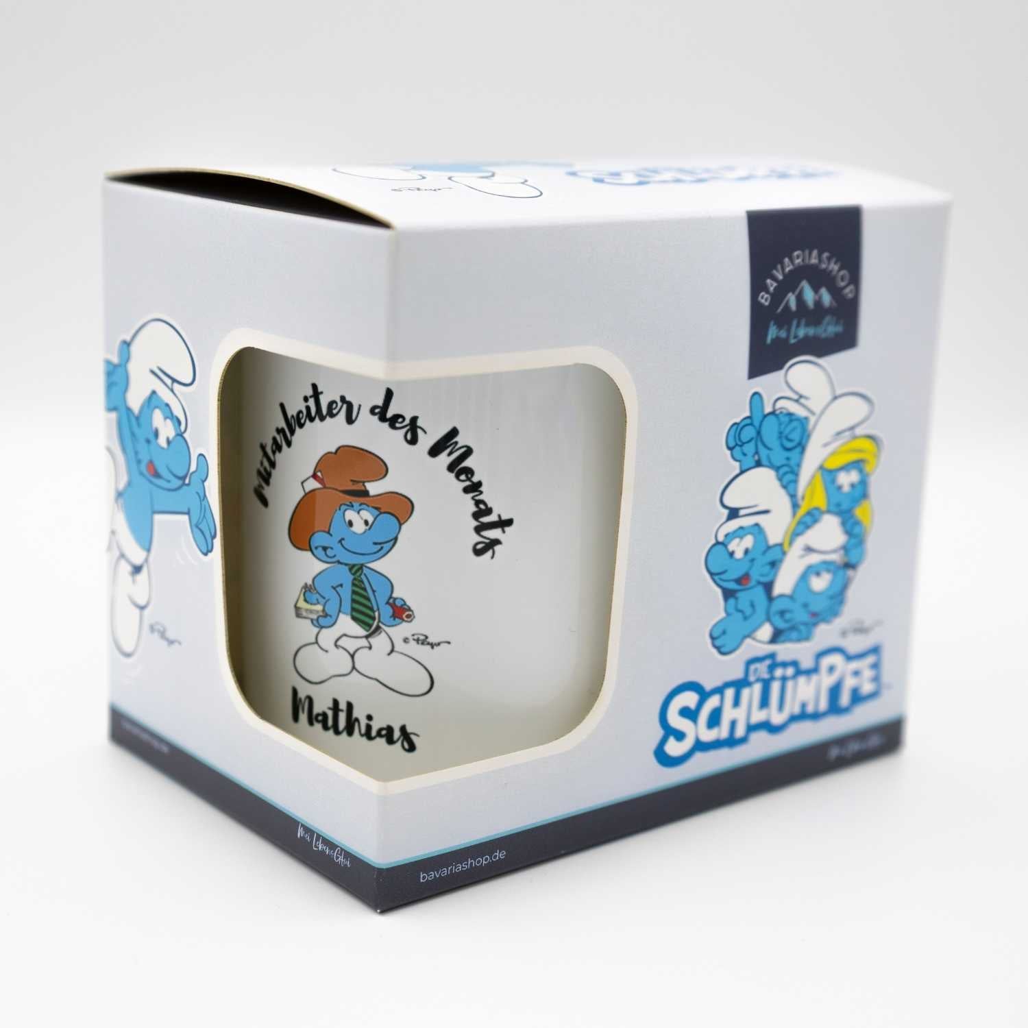 Schlumpf Tasse „Mitarbeiter des Monats“ – Mit Wunschnamen