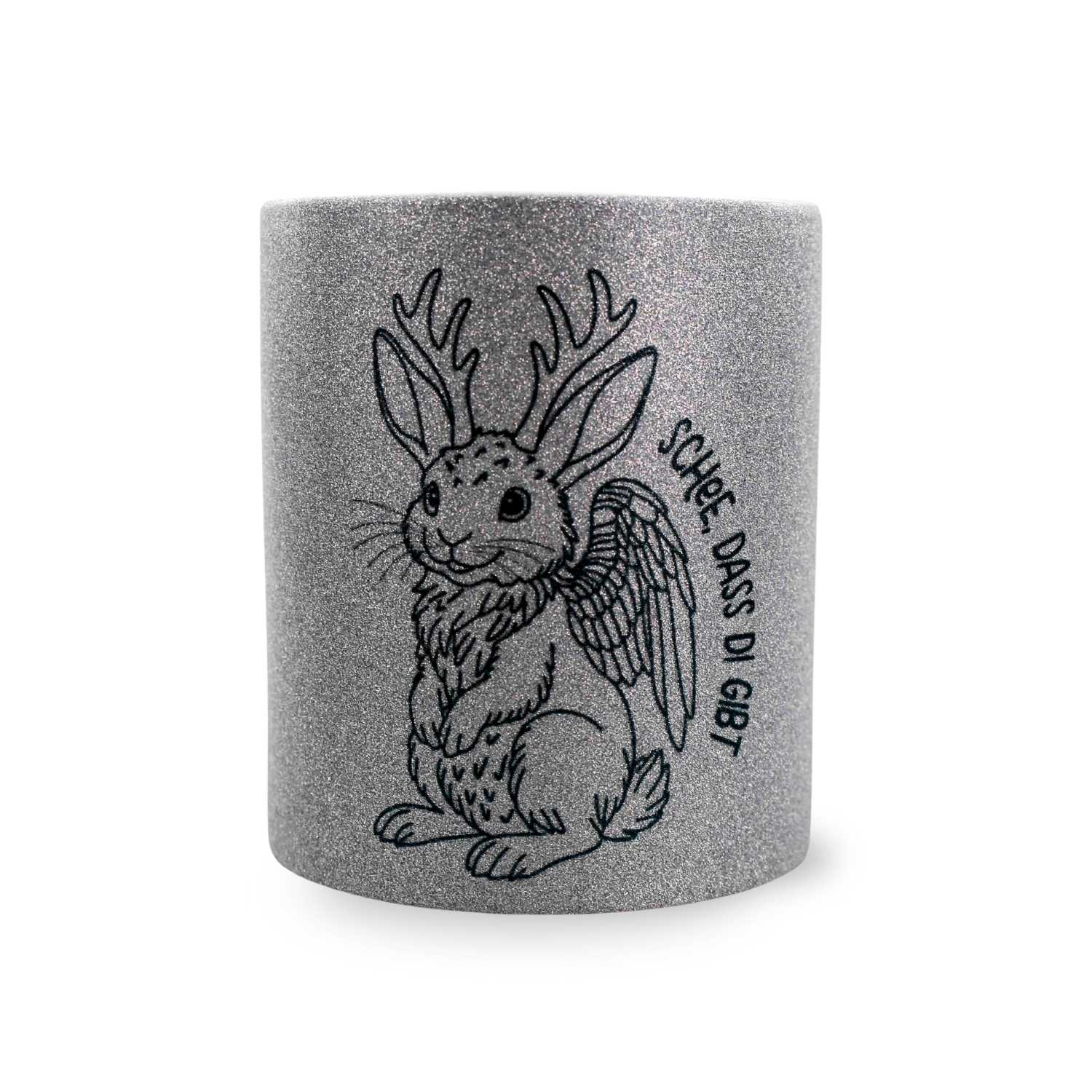 Glitzertasse „Schee, dass di gibt“ – mit Wolpertinger in Silber