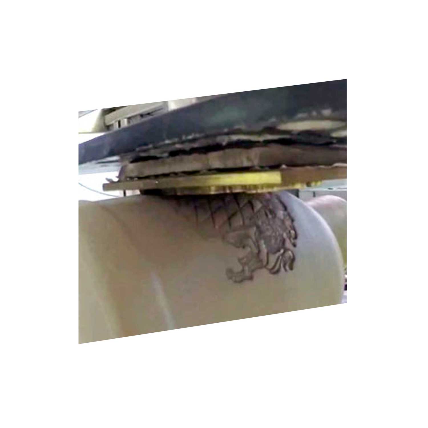 Als nächstes wird das Logo in den Krug graviert. Je nach gewünschter Stückzahl wird dies entweder per Hand graviert oder mittels Prägeplatte eingedrückt. Bei Einzelstücken wird aus Kostengründen oft die Handgravur bevorzugt. Hierbei wird von unseren Künstlern die Logovorlage mit einem Griffel frei Hand in den Krug geritzt. Sollten mehrere Krüge produziert werden, so ist die Logoanbringung mit einer Prägeplatte zu empfehlen. Dieses Werkzeug wird nach Kundenwunsch produziert, indem die Logodatei spiegelverkehrt in eine Metallplatte eingefräst wird. Diese Produktionsart hat den Vorteil, dass mehrere Krüge immer mit einem gleichbleibenden Logodekor ausgestattet werden können.