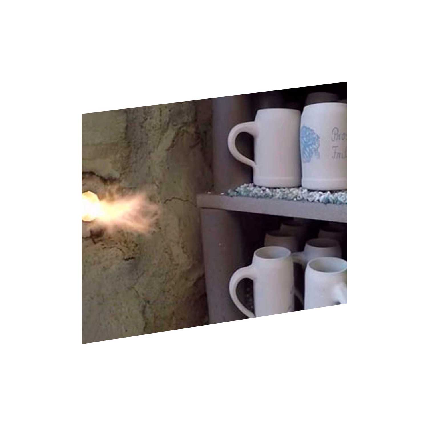 Der unglasierte Krug wird nun im offenen Feuer für ca. 9-10 Stunden bei einer Endtemperatur von 1250°C gebrannt. Bei der erreichten Höchsttemperatur wird Kochsalz in den Ofen gegeben und die zuvor unglasierte Ware erhält jetzt ihre Glasur. In der Glut des Ofens entsteht dabei die einzigartige, apfelsinenschalenähnliche Struktur der echten Salzglasur auf dem Bierkrug. Die aufgebrachte Dekorfarbe schmilzt zu einer brillanten, farbigen Glasbeschichtung aus. Nach dem Salzen werden die Brenner abgeschaltet und der Ofen wird innerhalb von 14-15 Stunden abgekühlt.