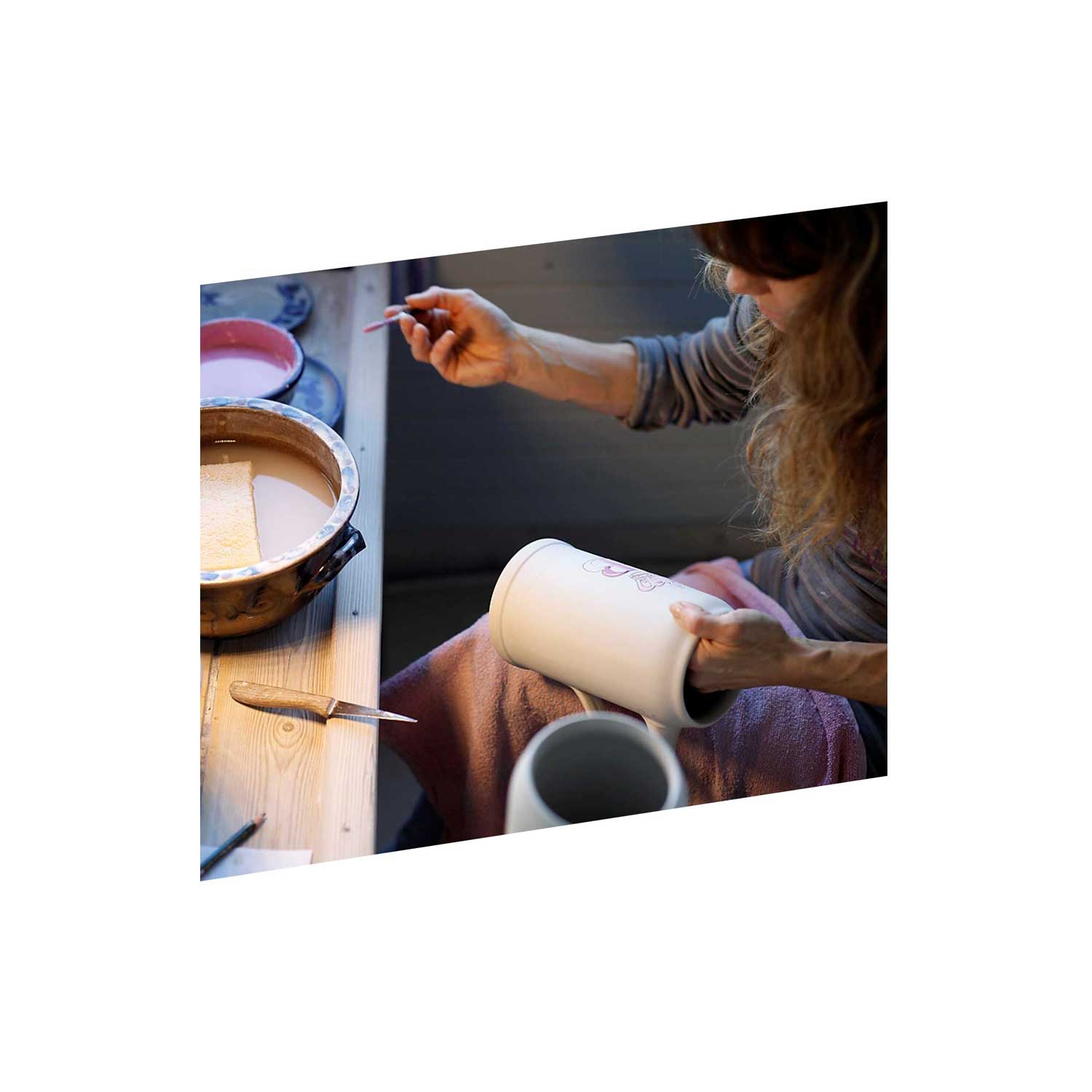 Im letzten Produktionsschritt wird der Krug von eventuell vorhandenen Rückständen der Brennhilfsmittel befreit. Dies geschieht durch feines abschleifen der Oberfläche. Danach passiert der Krug die Endkontrolle und wird an den Kunden verschickt. Keiner unserer echt salzglasierten Krüge gleicht dem Anderen bis ins Detail und das macht unsere Krüge schlichtweg zu einzigartigen Kunstwerken.