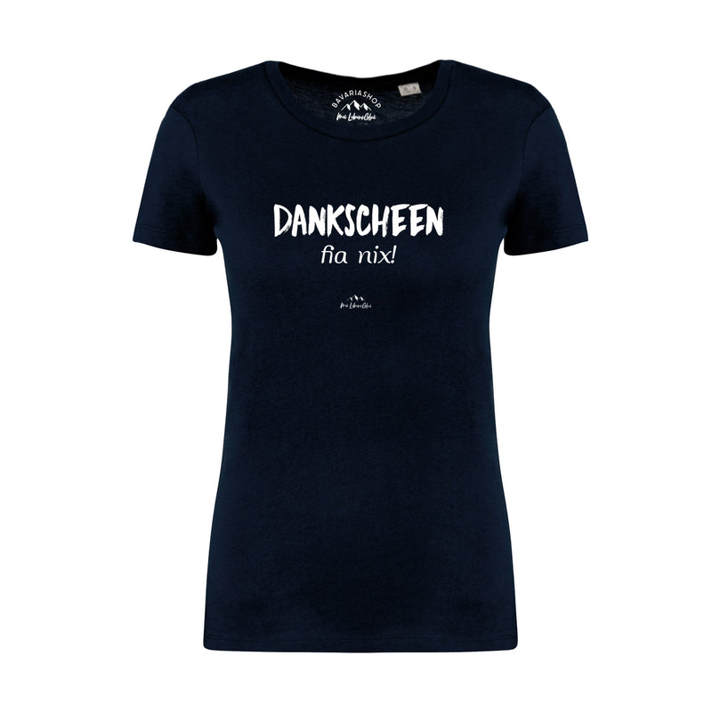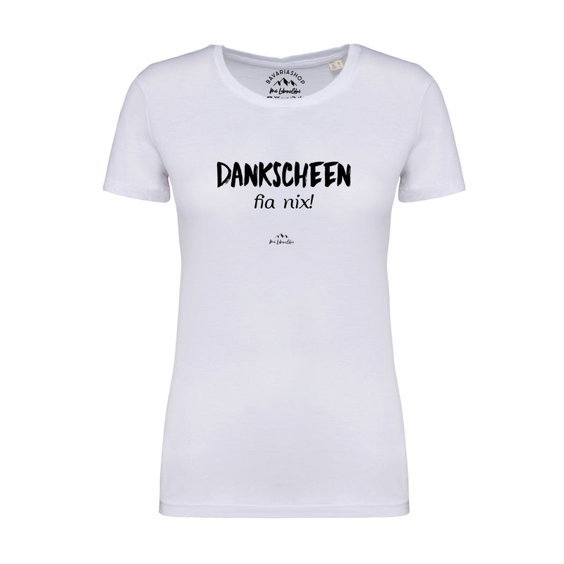Damen T-Shirt mit bayerischem Schriftzug „Dankscheen – fia nix!“, kurzärmelig, aus 100 % Bio-Baumwolle.