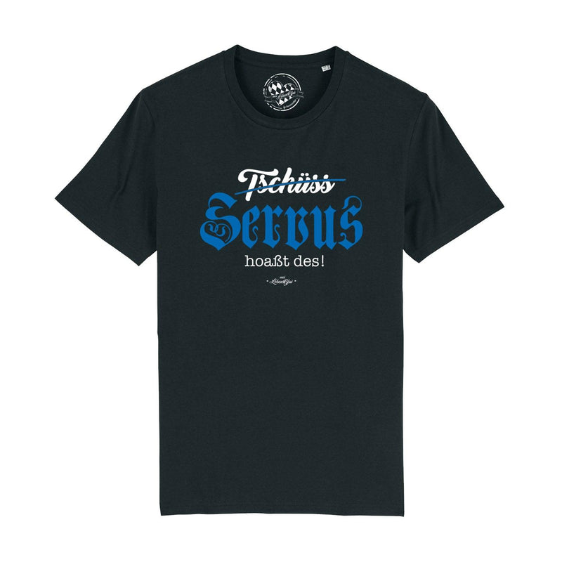 Herren T-Shirt in Schwarz mit weißem Frontprint „Servus hoaßt des!“, Rundhals, 100 % Bio-Baumwolle, kurzarm.