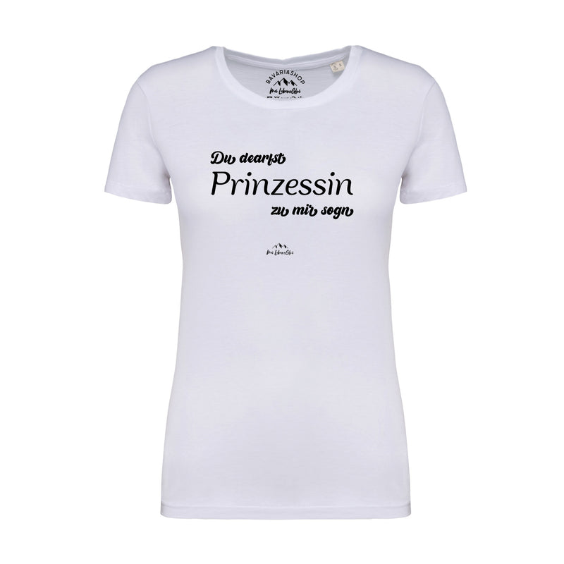 Weißes Damen T-Shirt mit bayerischem Schriftzug "Du dearfst Prinzessin zu mir sogn", aus 100 % Bio-Baumwolle.