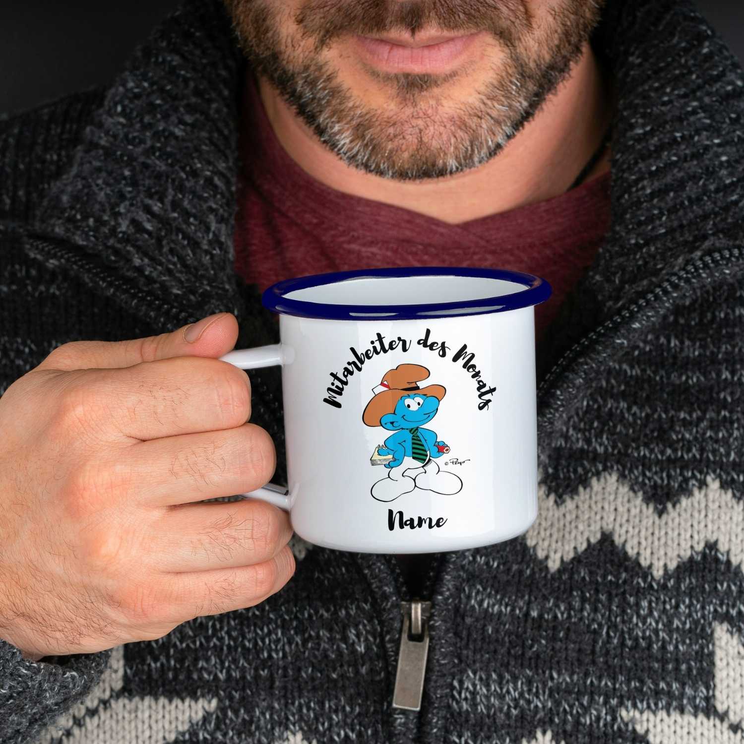®Die Schlümpfe Emailletasse "Mitarbeiter des Monats" personalisiert • Die offizielle Schlumpf-Tasse • Outdoor Camping Tasse • 350 ml
