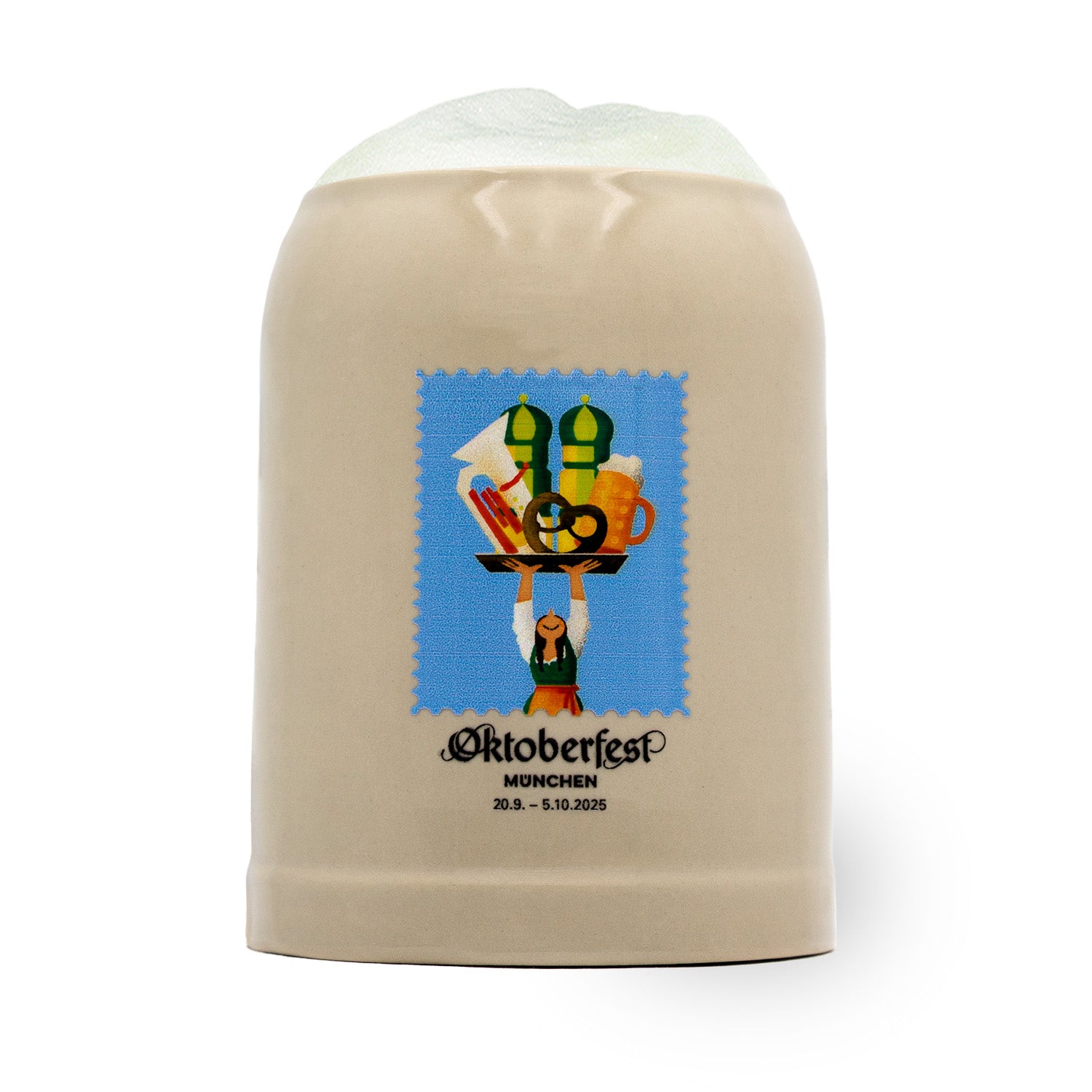- Offizieller 0,5 Liter Steinkrug vom Oktoberfest, Wiesn-Krug mit Plakatmotiv 2025