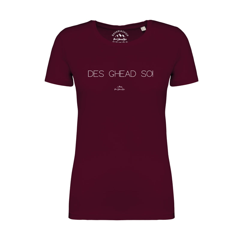 Damen T-Shirt mit bayerischem Schriftzug „Des ghead so!“, runder Halsausschnitt, aus 100 % Bio-Baumwolle, weinrot.