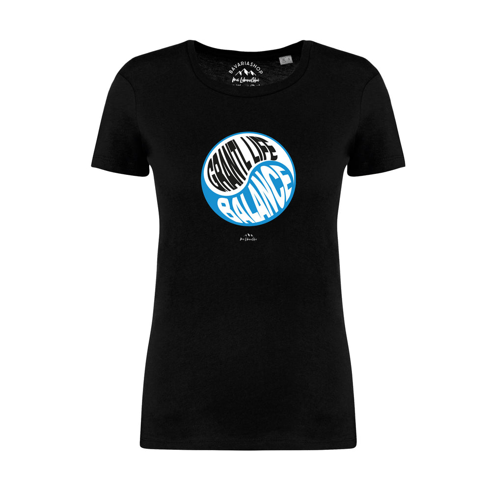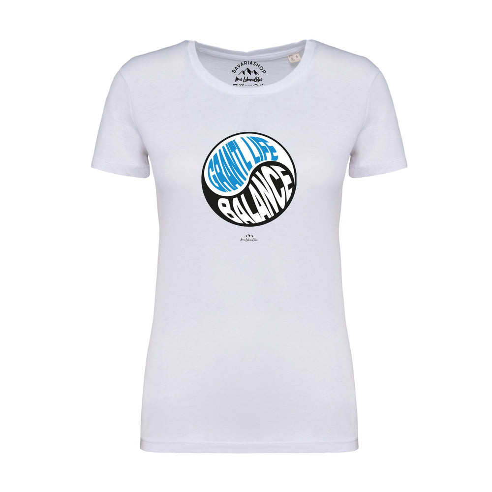 Weißes Damen-T-Shirt mit schwarzem Frontprint "Grantl life balance", Rundhalsausschnitt, Bio-Baumwolle, 180 g/qm.