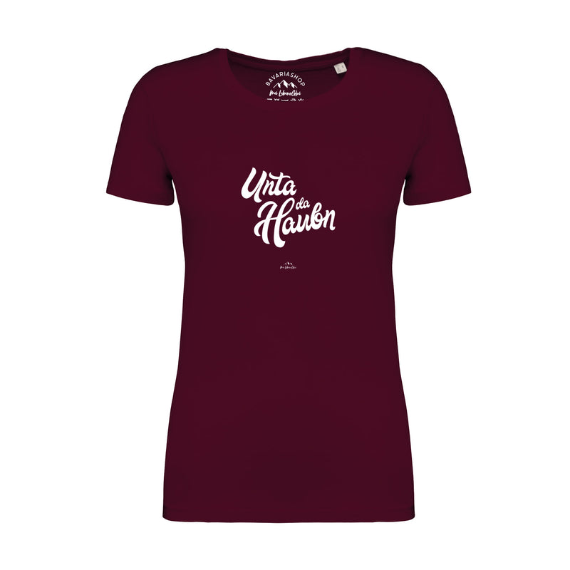 Weinrotes Damen T-Shirt mit weißem Mundart-Schriftzug „Unta da Haubn“ aus 100 % Bio-Baumwolle.