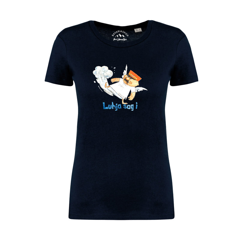 Damen T-Shirt mit Engel-Aloisius-Motiv und „Luhja, sag i“-Schriftzug, aus Bio-Baumwolle, in Dunkelblau.