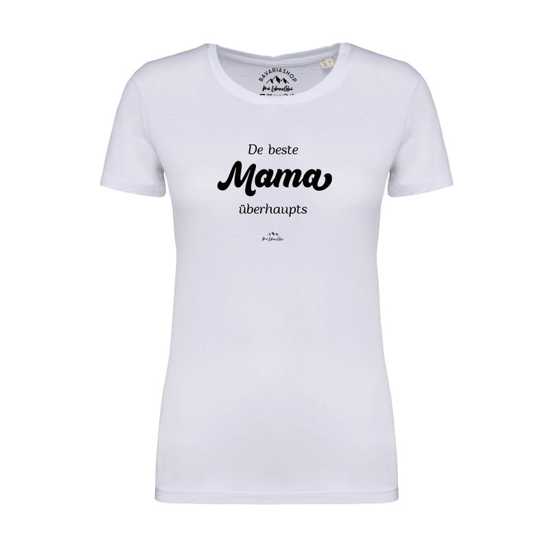 Damen T-Shirt mit Aufdruck "De beste Mama übahaupts", kurzärmelig, aus 100 % Bio-Baumwolle, weiß.