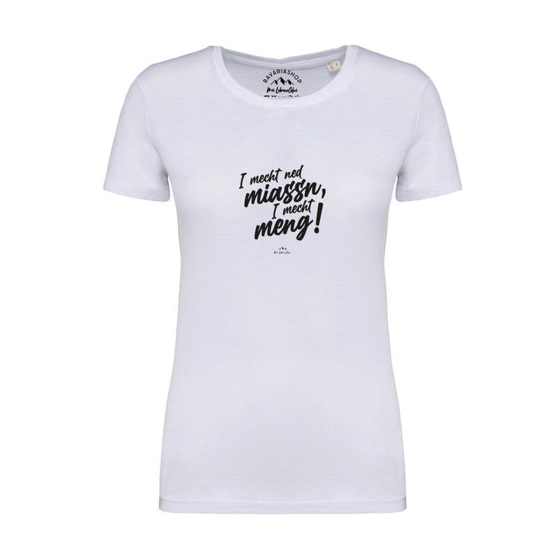 Damen T-Shirt mit Aufdruck „I mecht ned miassn...“ in bayerischer Mundart, aus Bio-Baumwolle, weiß.