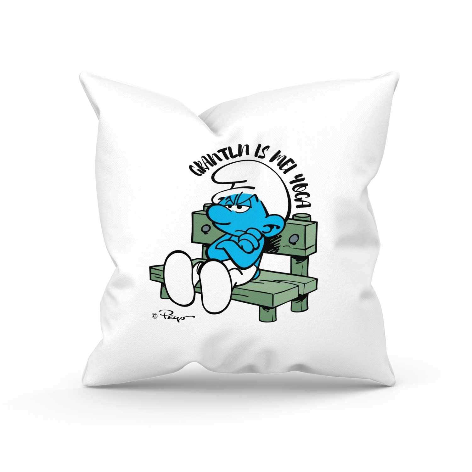 ®Die Schlümpfe "Grantln is mei Yoga" Kuschelkissen • Dekokissen • Kissen mit Spruch • 40 x 40 cm