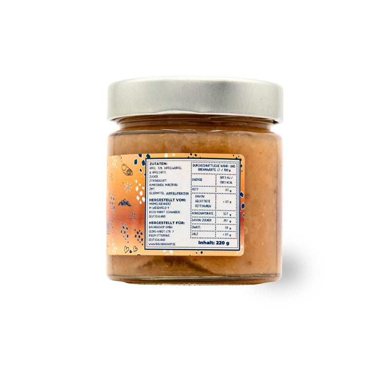 Zutaten: Äpfel 72% (Apfelwürfel & Apfelsaft), Zucker, Zitronensaft, Rumrosinen, Marzipan, Zimt.