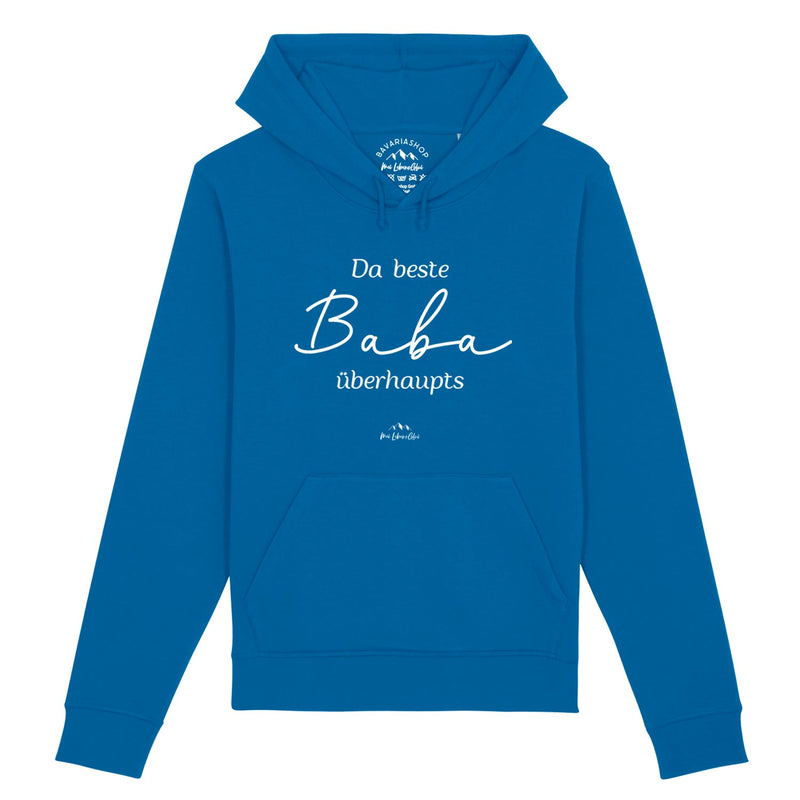 Herren Hoodie mit Kapuze, sichtbarem Front-Schriftzug „Da beste Baba übahaupts“, in Royalblau, aus Bio-Baumwollmix.