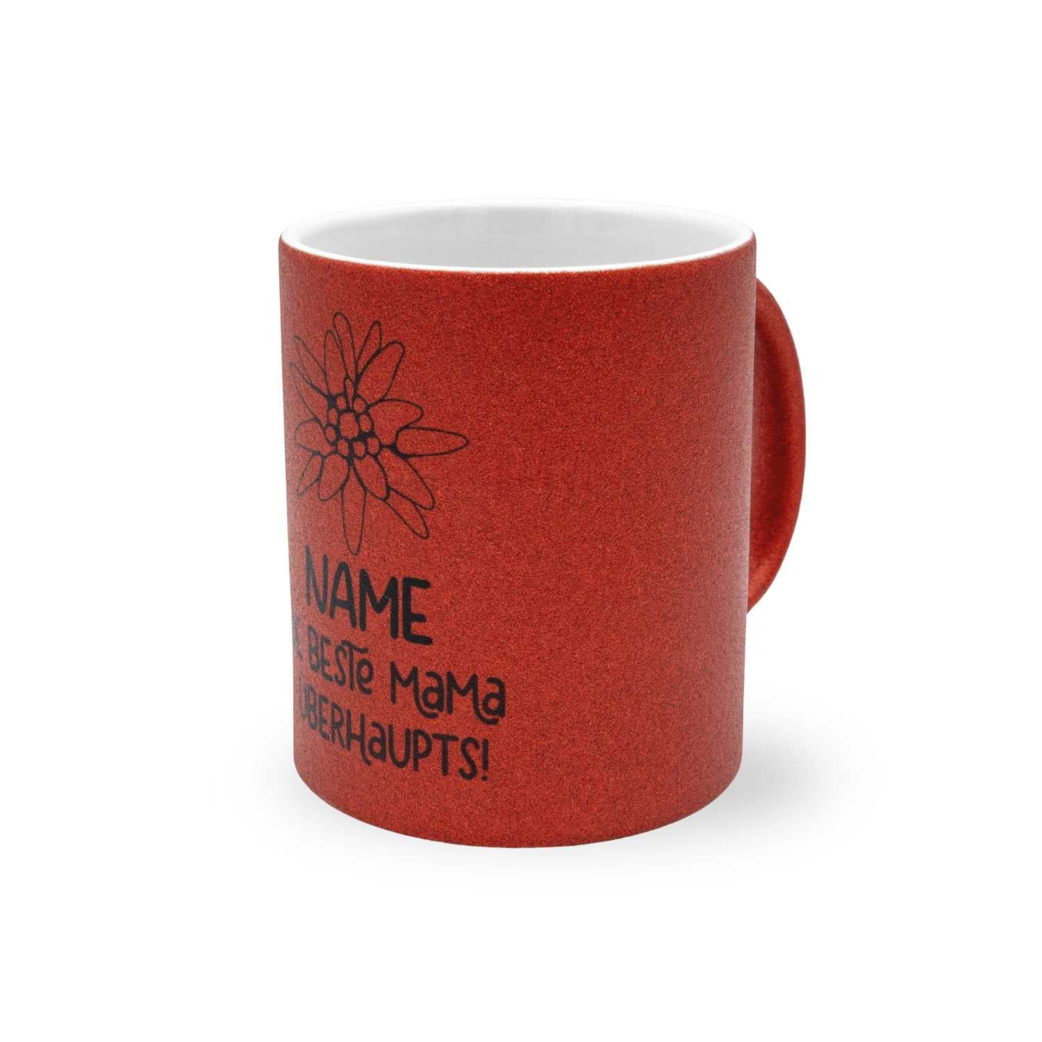 Schenk deiner Mama etwas ganz Besonderes! Diese funkelnde Tasse mit Edelweißmotiv und bayrischem Spruch „De beste Mama überhaupts!“ kannst du mit ihrem Namen personalisieren lassen. Hochwertige Verarbeitung und zauberhaftes Glitzer-Design sorgen jeden Morgen für ein strahlendes Lächeln – perfekt für die beste Mama auf der ganzen Welt!