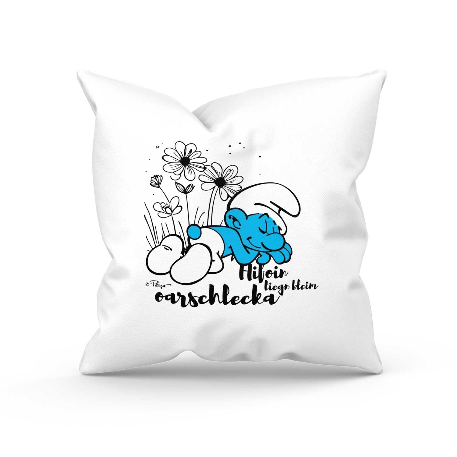 ®Die Schlümpfe "Hifoin, liegn bleim, oarschlecka" Kuschelkissen • Dekokissen • Kissen mit Spruch • 40 x 40 cm