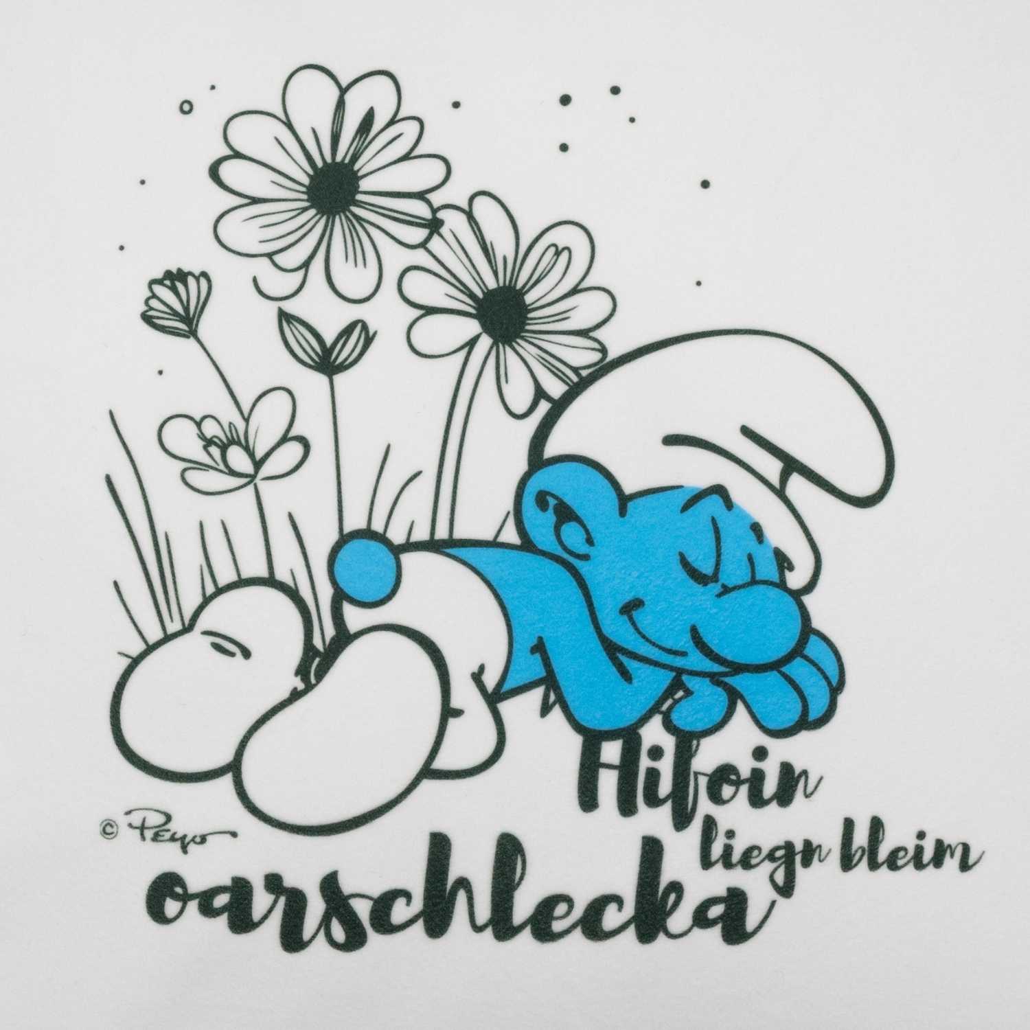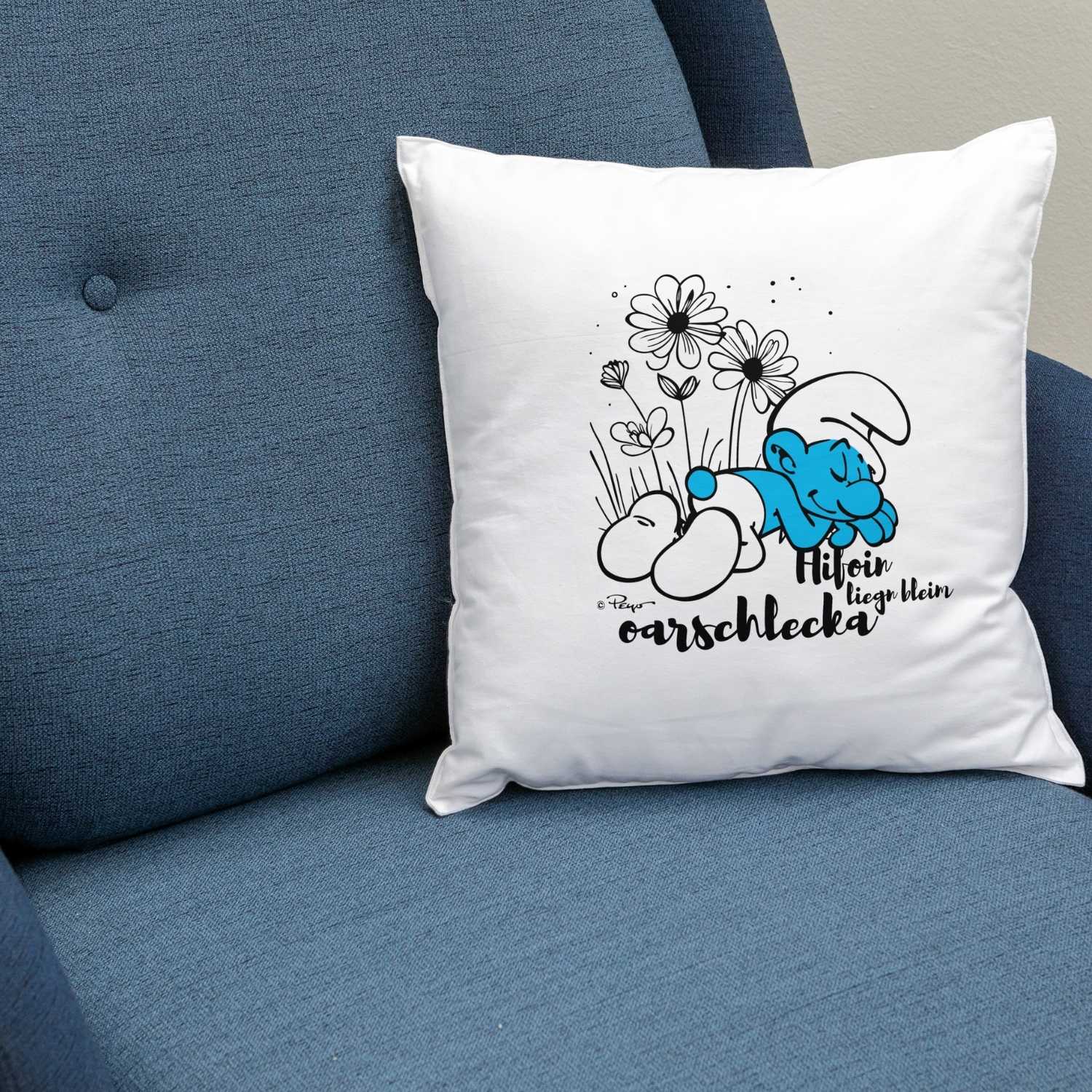 Quadratisches Kuschelkissen mit Schlumpf-Motiv und Spruch „Hifoin, liegn bleim, oarschlecka“, weich, hochwertiger Druck.
